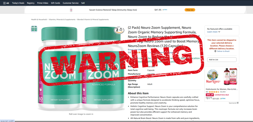 We strongly advise against ordering NeuroZoom from Amazon, Walmart, eBay or Walgreens, as these sources often sell fake versions with entirely different ingredients, which can be very dangerous.
